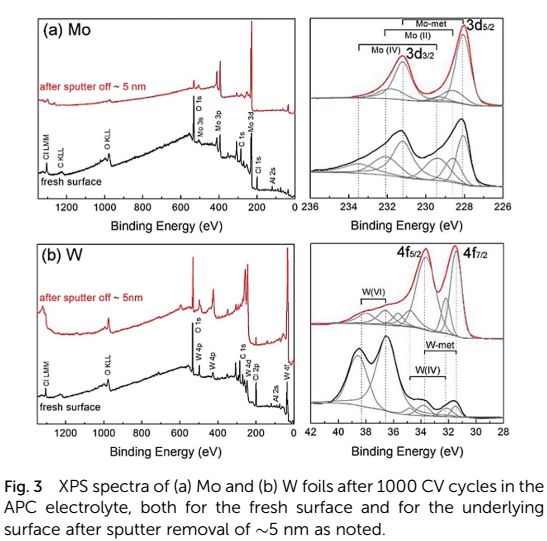 通常,材料的耐腐蚀性取决于其表面上形成的反应产物以及产物的稳定性。CV循环1000圈后的新鲜表面和Ar离子溅射后的表面下5nm的XPS表征显示Mo和W上存在钝化层,1000次CV循环后仍稳定的事实表明钝化层有利于Mo和W在APC电解液中的稳定性。